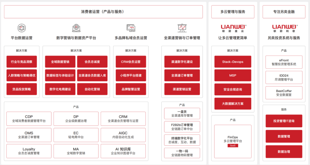 联蔚数科自2000年创立以来,始终深耕于大消费行业领域,以“产品+服务”的全方位解决方案推动企业数字化变革。业务领域涵盖六大板块:平台数据运营、数字营销与数据资产平台、多品牌私域会员运营、全渠道营销与订单管理、多云管理与服务、另类投资系统与服务。