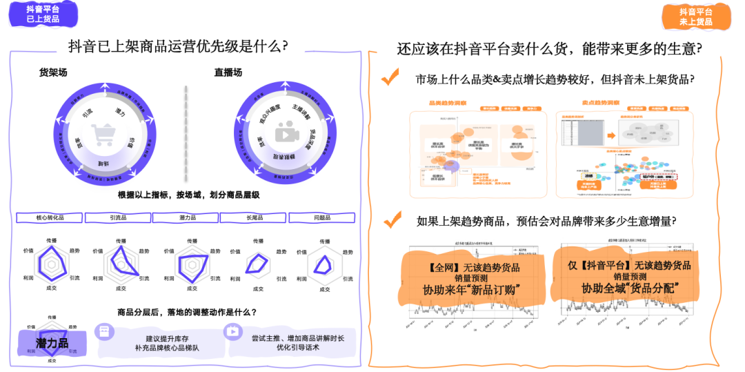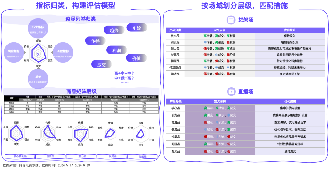 依托抖音的货架场和直播场,联合品牌统计分析所有标签和KPI指标,归类至能力六象限(传播、价值、利润、成交、引流、趋势),然后基于统计表现实现货品分层识别,如主推品、潜力品、淘汰品;