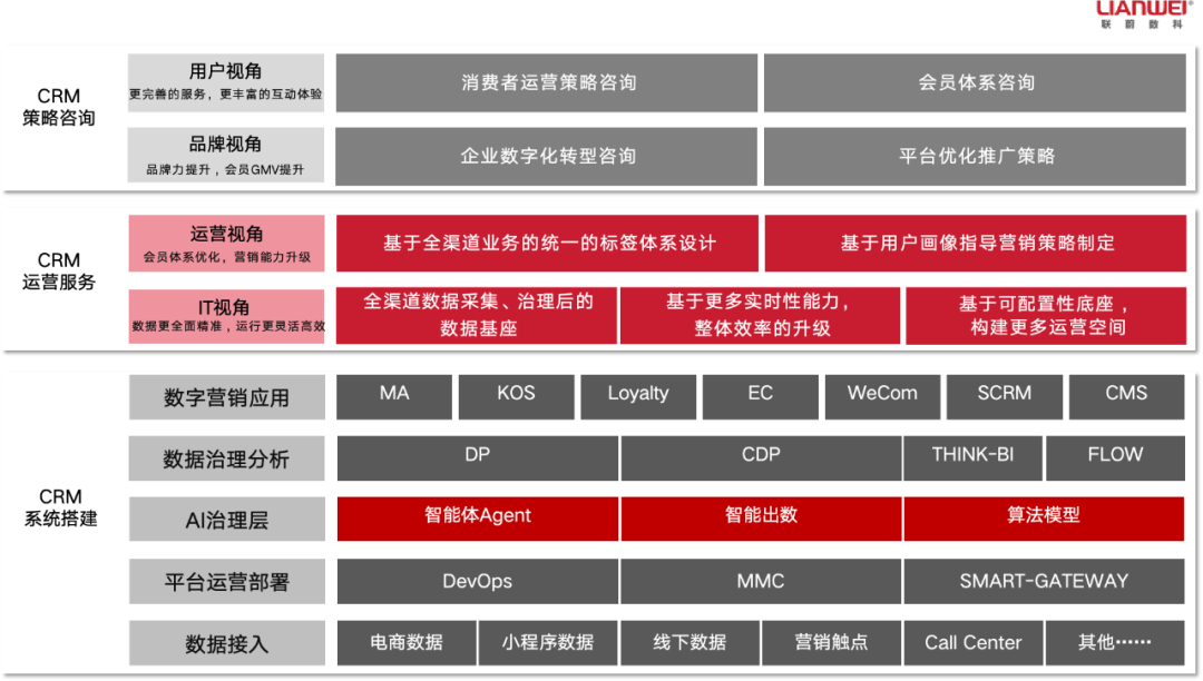 为了应对这些变化,联蔚将AI能力深度整合进全链路CRM系统,覆盖「业务咨询、运营服务、系统搭建」业务闭环,通过智能预测、个性化内容及智能推荐、灵活响应,我们帮助企业更好地理解和服务不同层次的消费者。