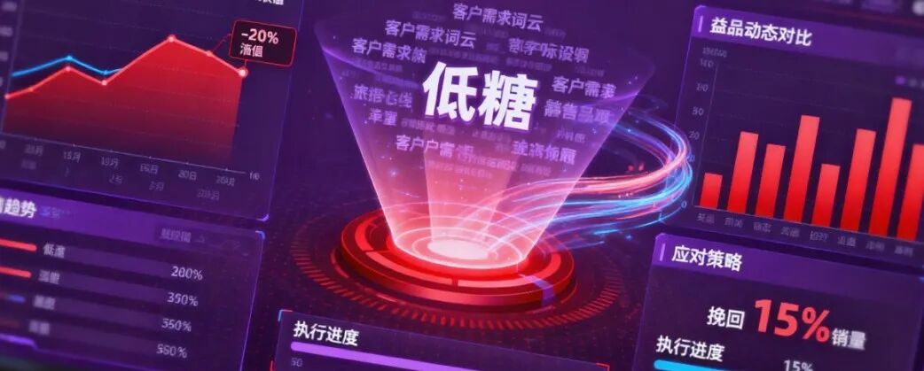 基于此洞察,企业快速制定应对策略:“在该区域推低糖饼干试吃活动,调整铺货比例”,在四周内成功挽回15%的销量损失。